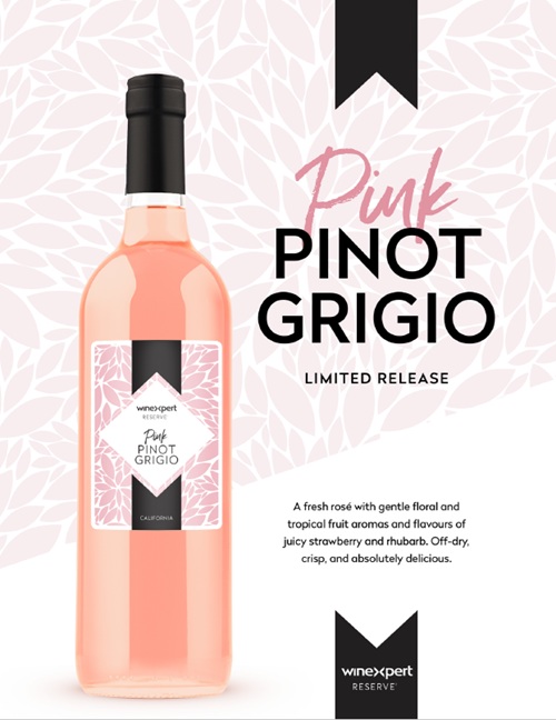 Just Fine Wine is extremely excited to reintroduce this off-dry, crisp rosé to the Winexpert Reserve lineup this February…for a limited time only. Pink Pinot Grigio features gentle floral and tropical fruit aromas with flavours of juicy strawberry and rhubarb. With its salmon-pink hue, this wine is as striking as it is delicious. Perfect for Spring and Summer sipping, this wine will have you TICKLED PINK.